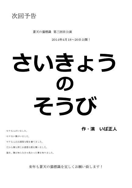 蒼天の猫標識 第三回公演 「さいきょうのそうび」 【作・演出】 いば 正人 【キャスト】 幸成 茂 上座 ぎん 佐倉 悠斗 時田 せい子(劇団ものありき) 土方 智哉(劇団都市伝説) まとい(フリー) きら えみあ(TOY☆JAM) 【照明】 篠田 陽介 【音響】 林 興弘(劇団緑の風車) 【舞台監督】 いば 正人 【舞台美術】 蒼天の猫標識 【制作】 ジン 2014年4月18日~20日。 名古屋市青少年交流プラザユースクエア1Fプレイルームにて。 乞うご期待くださいませ! 『バスが来ない』の折り込み情報になります。