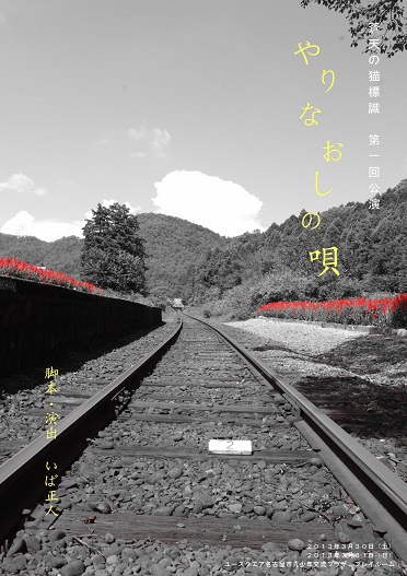 蒼天の猫標識 第一回公演 『やりなおしの唄』 脚本・演出 いば 正人 【キャスト】 上座 ぎん 葵向 ヤド(劇団ものありき) 伊藤 裕次郎(O-sun's company) 篠田 陽介 ジン 竹見 なすか 時田 せい子(劇団ものありき) 土方 智哉(O-sun's company) みほ。(フリー) 【場所】 名古屋市青少年交流プラザ プレイルーム 【日時】 2013年3月30日(土)14:00~ 19:00~ 2013年3月31日(日)14:00~ ※開場は開演の30分前 【料金】 全日無料 まもなく
